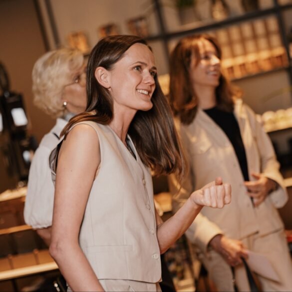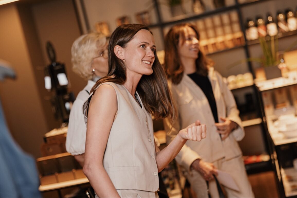 Veiklių moterų kompanija trečiadienio vakarą rinkosi į parduotuvę Kaune ir išbandė netikėtus drabužių ir juvelyrikos derinius. Moterys stebėjosi kasdienio stiliaus marškinėlių ir elegantiško perlų vėrinio kombinacija – kaip lengvai galima pakeisti įvaizdį tinkamai parinktu papuošalų deriniu.