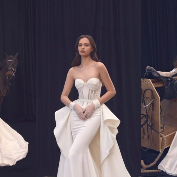 Juodame fone stovintys žirgai atskleidžiami ne tik kaip gražūs padarai, bet ir kaip stiprybės, laisvės bei gracijos atspindžiai. Jų buvimas sukuria ramybės ir vienybės jausmą – tarsi būtų sukurtas eterinis ryšys tarp moters ir gyvūno. Suknelių struktūriniai siluetai atgyja su ramia jėga – kiekvienas klostės vingis ir kontūras skleidžia tylų pasitikėjimą ir grakštumą.
